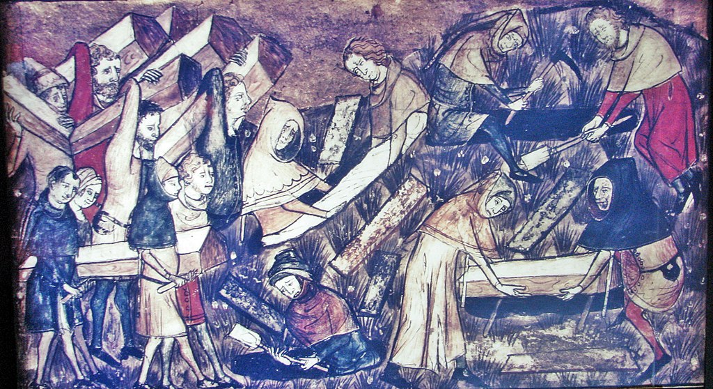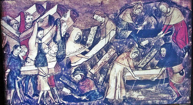 English: Exhibit depicting a miniature from a 14th century Belgium manuscript at the Diaspora Museum, Tel Aviv - en:Beit Hatefutsot. The museum note says "The citizens of Toumai bury their dead during the black death. Miniature from manuscript, Belgium, 14th century". (Photo was taken by en:User:Sodabottle) |